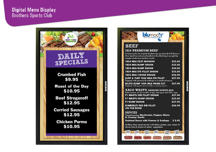 Digital screens have been a great success for the companies we have worked with. Digital Menu Display seems to be a popular choice for restaurants, bistros and pubs. Stylishly showcase your daily specials or full menu on our high definition displays and when your menu changes quickly and easily update the information on your local computer and load it back onto the screen before service.